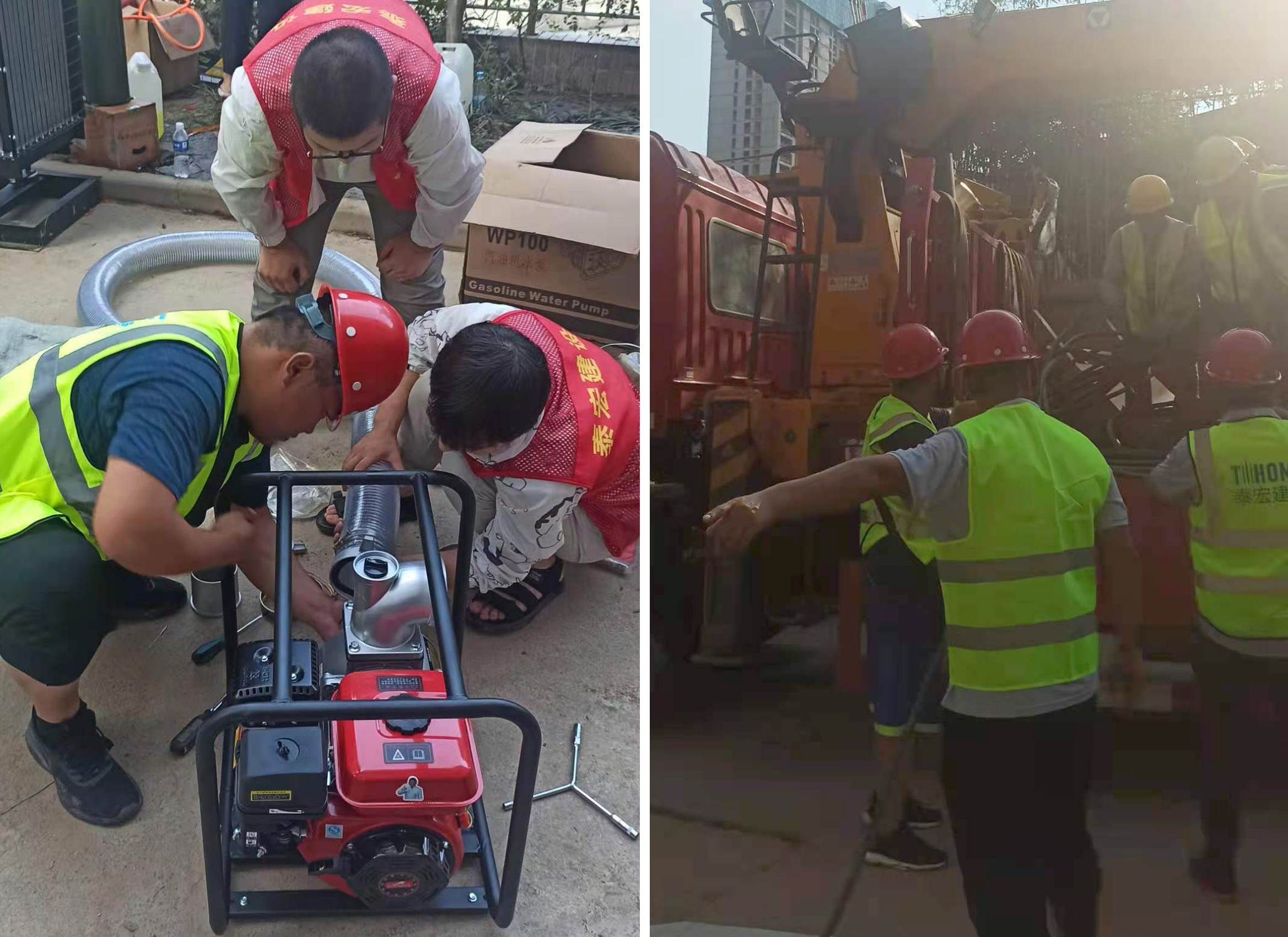 按照市住建局部署,公司统一安排,泰宏建设第一公司各项目立即奔赴金水区丰产路办事处东峰听橹小区,天裕小区,郑州商务宾馆,红旗路80号院、94号院,尚城宾馆,爱泊酒店等地方参与灾后救援排水工作。公司总经理宋广明亲自上阵安排、指挥,常务副总赵建国,第一公司王道军,王刚,秦朝,董政,杨强、倪铁虎等领导按照分工,立即组织现场排水。各项目携带发电机组,抽水泵等设备积极投身一线,在最快的时间完成现场调配调试,开展排水工作。