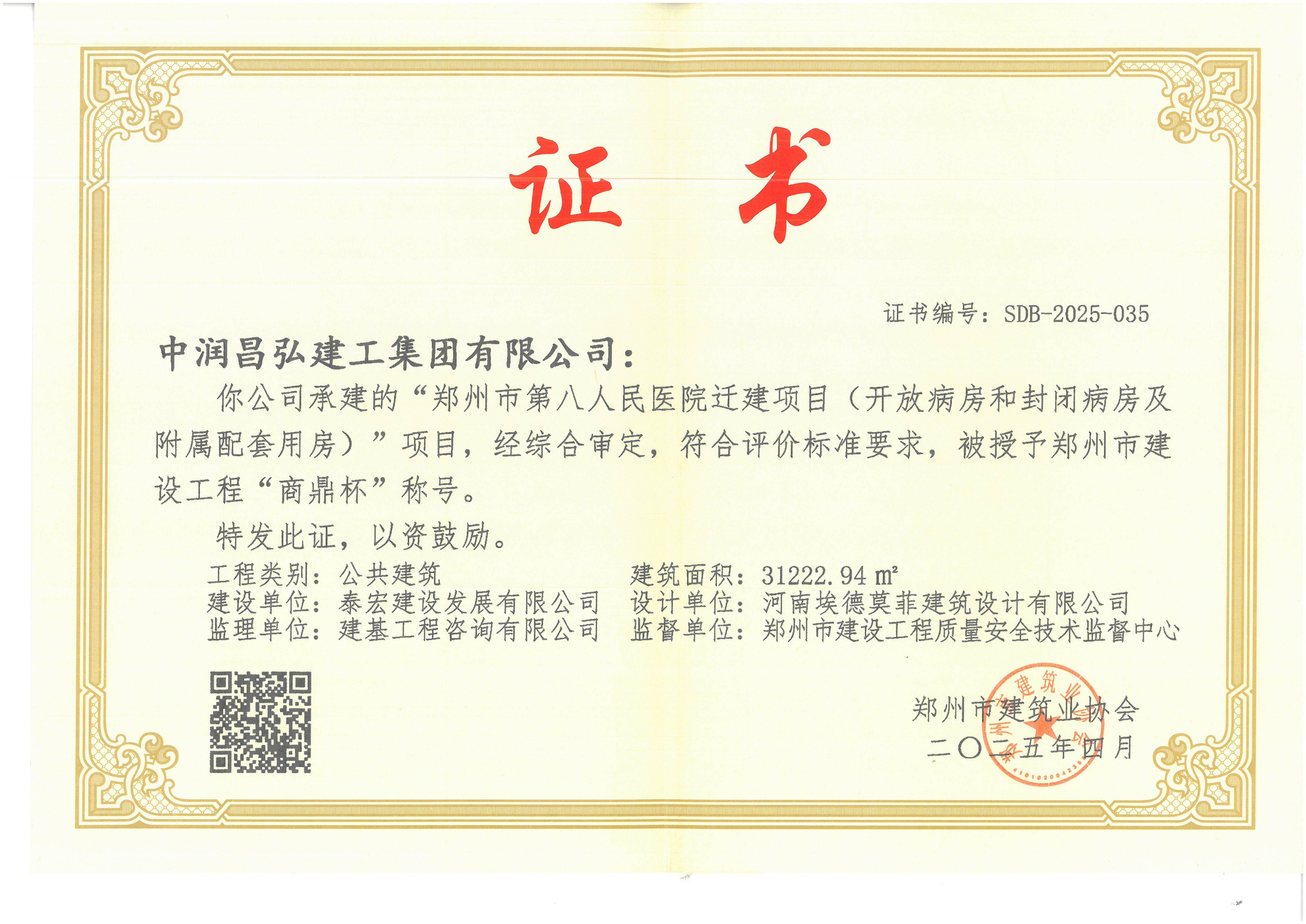 近日,九州体育网页版登录入口·(中国)官方网站承建的省直青年人才公寓博学苑项目、金岱智慧产业园二期项目及代建的郑州市第八人民医院迁建项目被郑州市建筑业协会授予郑州市建设工程“商鼎杯”称号。
