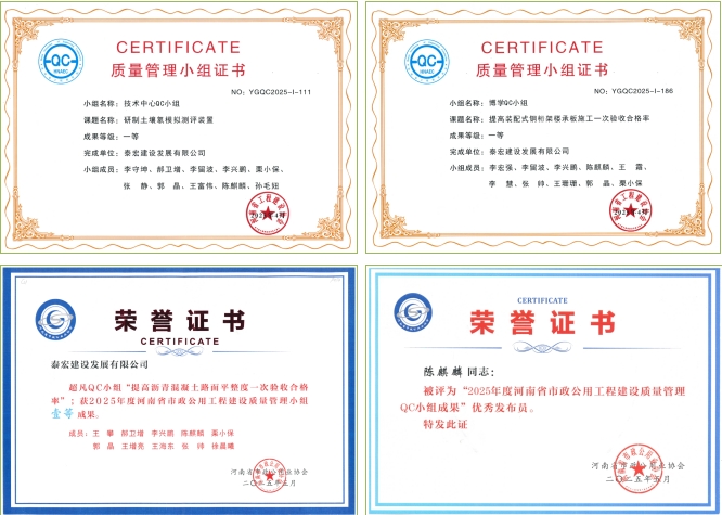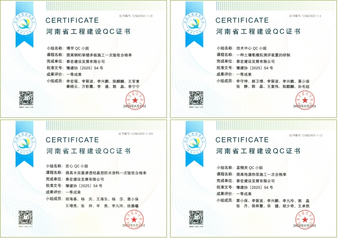 近日,泰宏建设领取了河南省建筑业协会颁发的4QC成果证书。至此,泰宏建设申报的7项省级QC成果全部发布完成,均荣获一等奖,取得丰硕成果。其中,2项成果推荐至中国建筑业协会、中国市政协会进行发布。